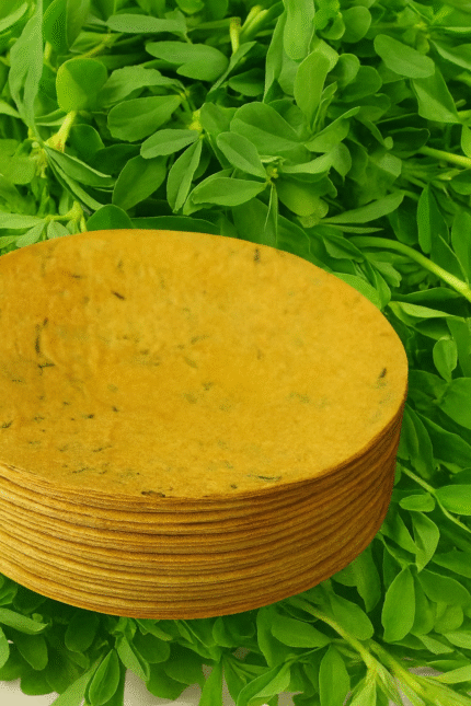 Traditional Methi Khakhra – a famous Gujarati snack made from whole wheat flour, fenugreek leaves, salt, and cumin seed powder, handmade and perfectly roasted.