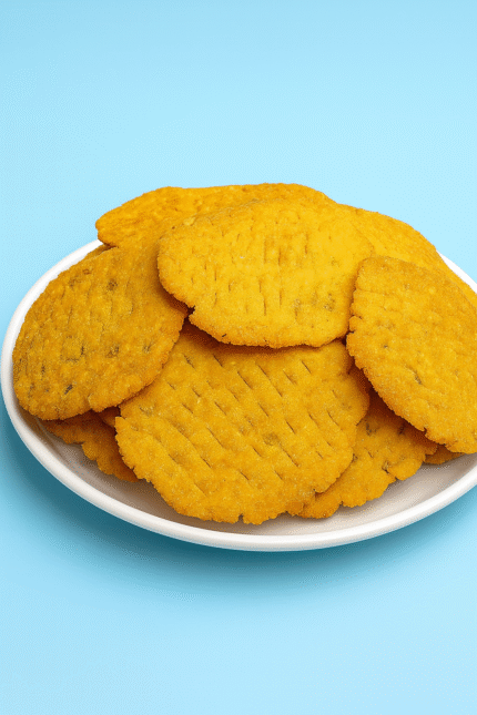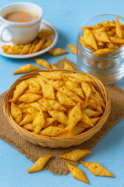 Crispy Namak Para – a traditional snack made from white flour, semolina, ajwain, cumin, black pepper, and fried in refined sunflower oil for the perfect crunch.
