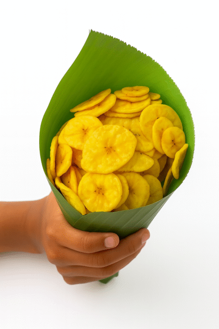 Crispy Yellow Banana Chips – made from raw bananas, fried in coconut oil, and seasoned with salt & turmeric for a golden crunch.