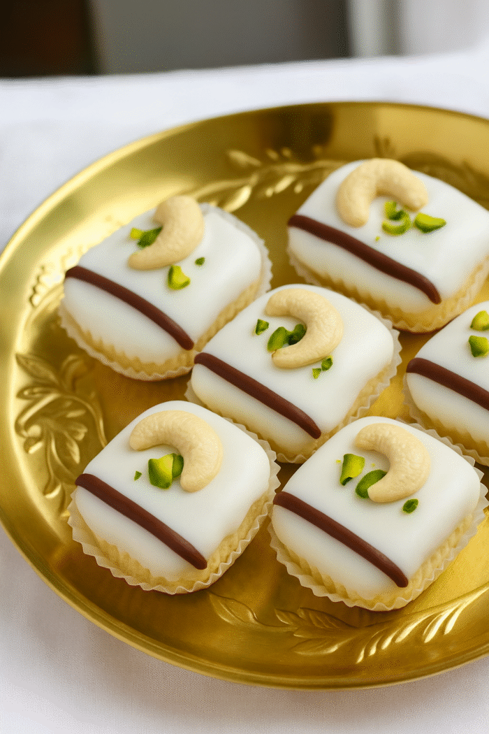 Royal Pista Burger Sweet – made from pure cashews mixed with pistachios, given a natural green touch, and topped with white chocolate & pista cuts.
