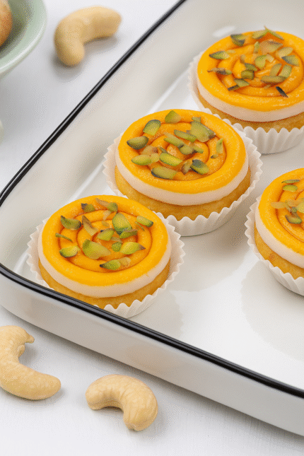 Royal Dryfruit Jalebi – made from cashews, filled with saffron dry fruits, shaped like a jalebi, and topped with crunchy pista chips.