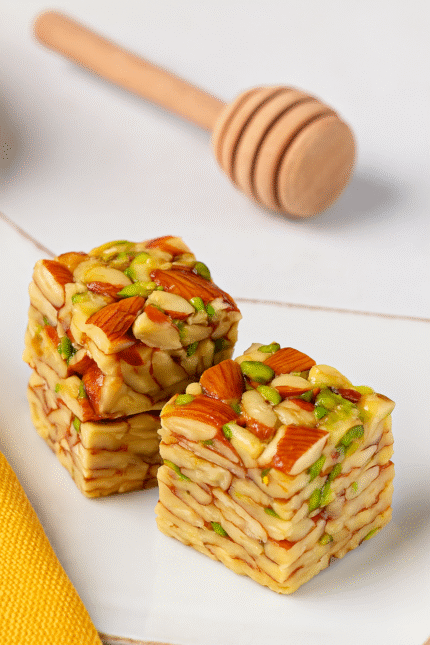 Healthy Honey Almond Sweet – made from pure cashews, enriched with almonds, and sweetened naturally with honey (sugar-free).