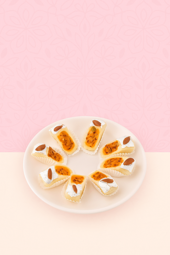 The sweet is beautifully finished with a layer of shining silver varakh and garnished with crunchy almond slices, making it as elegant as it is delicious. With its creamy texture, floral aroma, and royal presentation, Kesar Cream Sweet is perfect for festive gifting, family celebrations, or enjoying as a special indulgence.