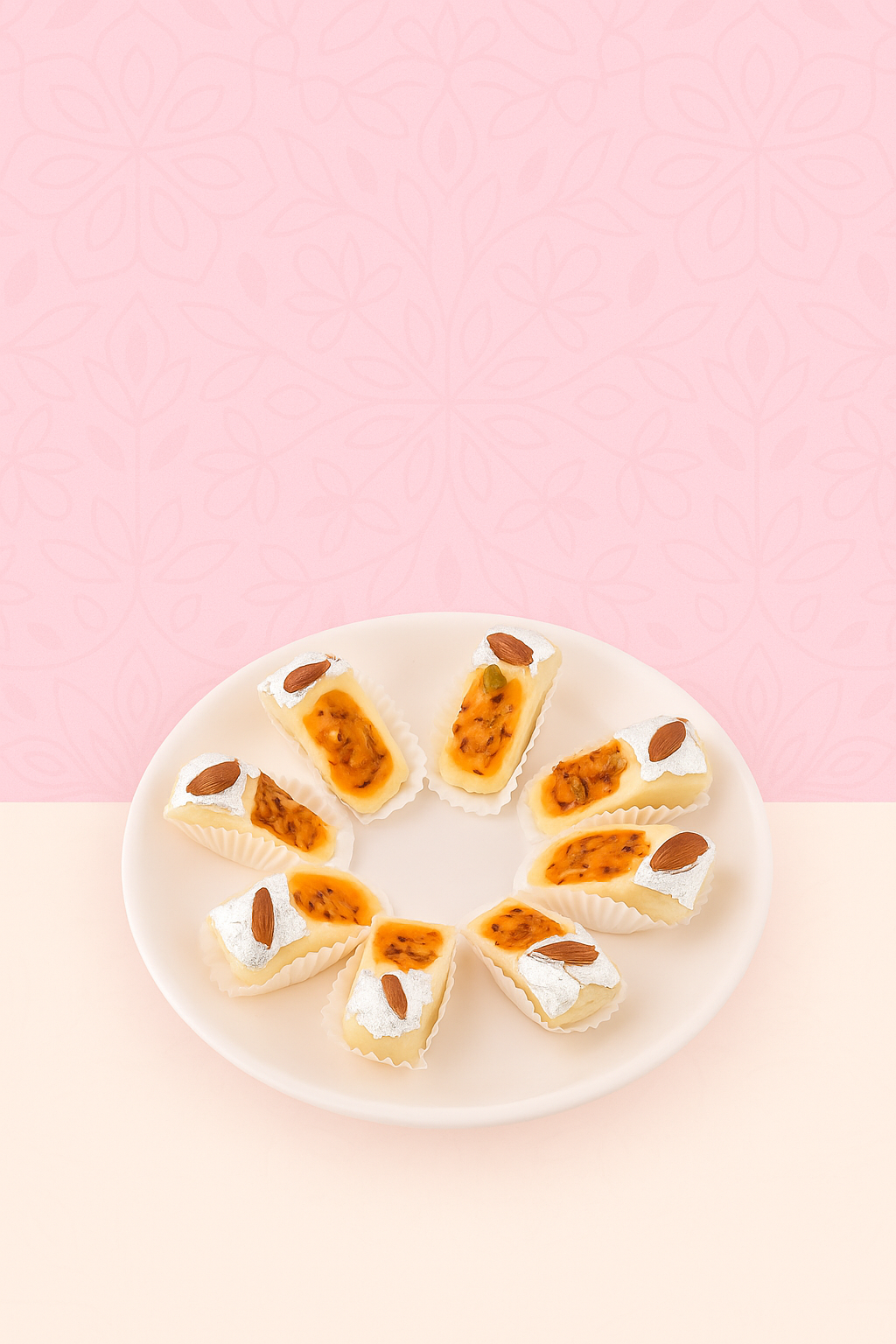 Our Kesar Cream Sweet is a luxurious mithai that combines the richness of milk with the aromatic touch of saffron (kesar). Each piece is filled with a delightful stuffing of gulkand and a hint of kesar, creating a refreshing and flavorful blend inside.