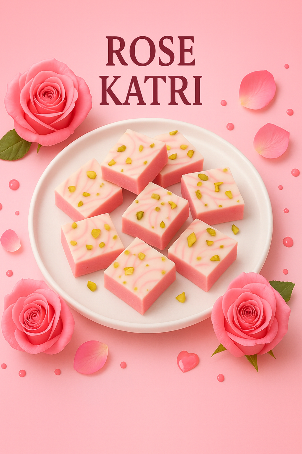SEO Keywords: Rose Katri, best-selling kaju sweet, rose cashew mithai, low sugar sweet, white chocolate topping mithai, pistachio garnish sweet.