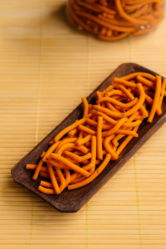 Crispy Masala Sev – made with besan and spices in pure peanut oil, soft yet crunchy, a tasty snack for all ages.